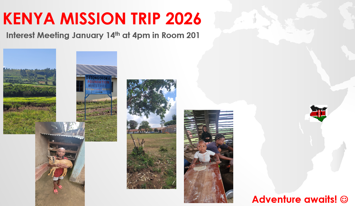 The interest meeting for the summer Kenya trip is coming up Wednesday! Join us if you want to find out more about this exciting trip.