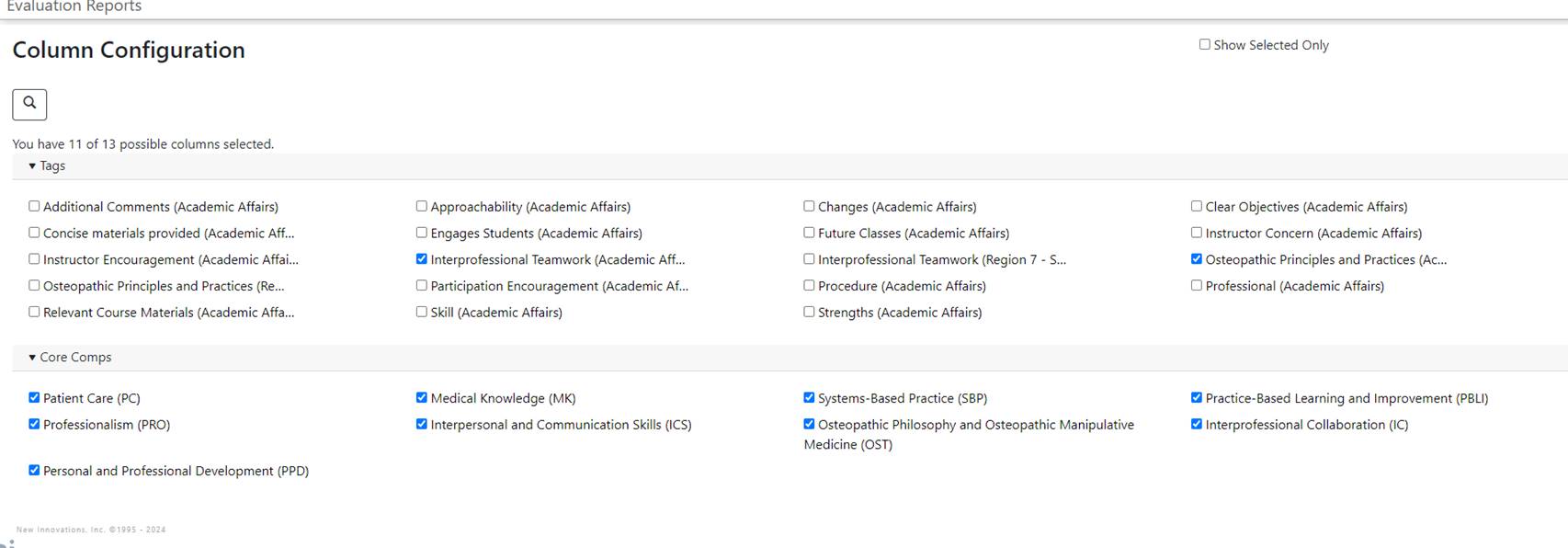 When you are reviewing your evaluation score in New Innovations, please click on the highlighted box (towards the top right of your page) and make sure the appropriate columns are selected. This will ensure you are seeing the score we use, based on the areas you are evaluated on.