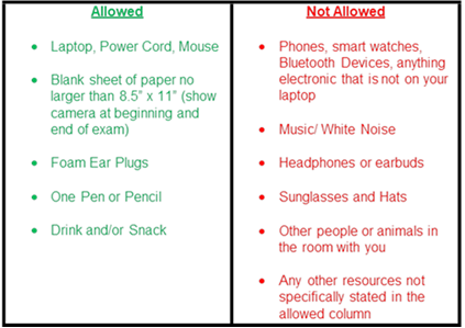 Please see below the passwords for Quiz 1. The upload deadline is 8:30 am. ExamID will verify your identity and then allow you to enter the quiz. Please remember to scan the room at the beginning of the exam (once you are being monitored) as well as show the front and back of your scratch paper at the beginning and the end of the assessment. The chart of what is allowed and not allowed in the room is included below.