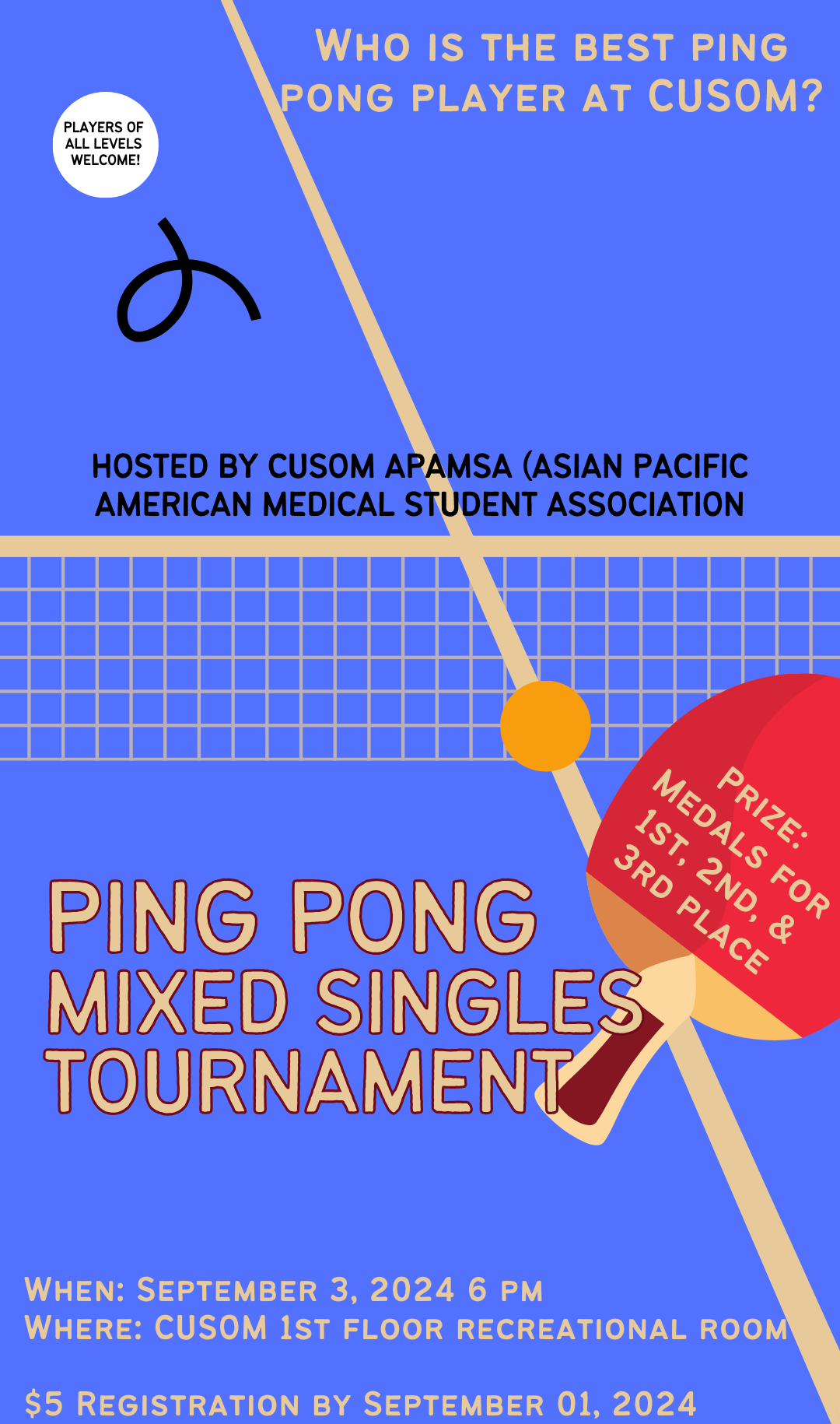 It will be our first annual CUSOM Ping Pong Tournament in the entertainment room on the first floor of campus! The event is open to everyone and for all levels of experience!