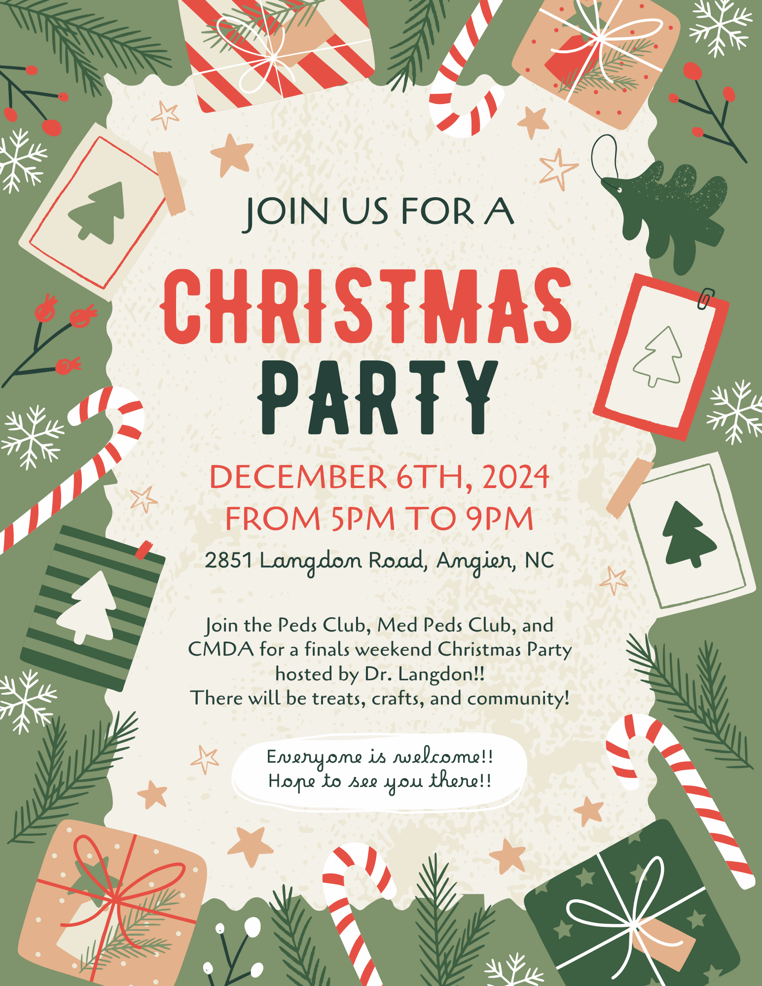 This Friday December 6th, take a break from your finals studying to join Peds club, CMDA, and Med-Peds for the jolliest Christmas bash! There will be crafts, snacks, and good company. It is an open house style event from 5-9 so you are free to stay as long or short as you want :)