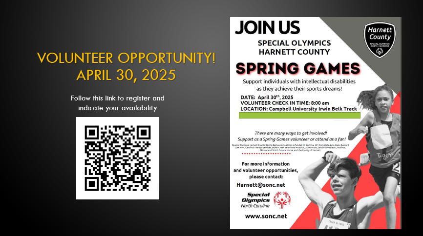 The Special Olympics will happen at Campbell University on the field behind the Convocation Center next week, on April 30th!
