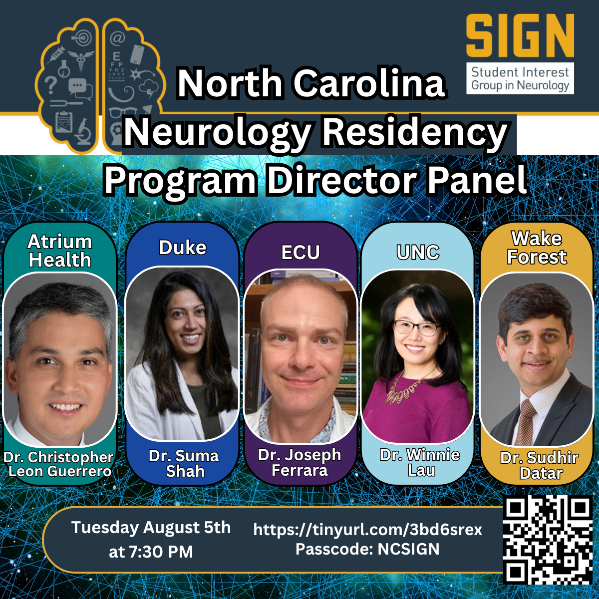 This is a friendly reminder from Neurology Club that UNC's SIGN chapter is hosting a panel with different residency program directors in North Carolina on Tuesday, 8/5 at 7:30 PM via Zoom (https://zoom.us/j/92894352975?pwd=bhyBUvalgD97aCcGqK1pGT1bb6SXax.1). They were able to add Dr. Joseph Ferrara, the residency program director of ECU, as another panelist. It should be a really beneficial event to anyone interested in pursuing neurology!