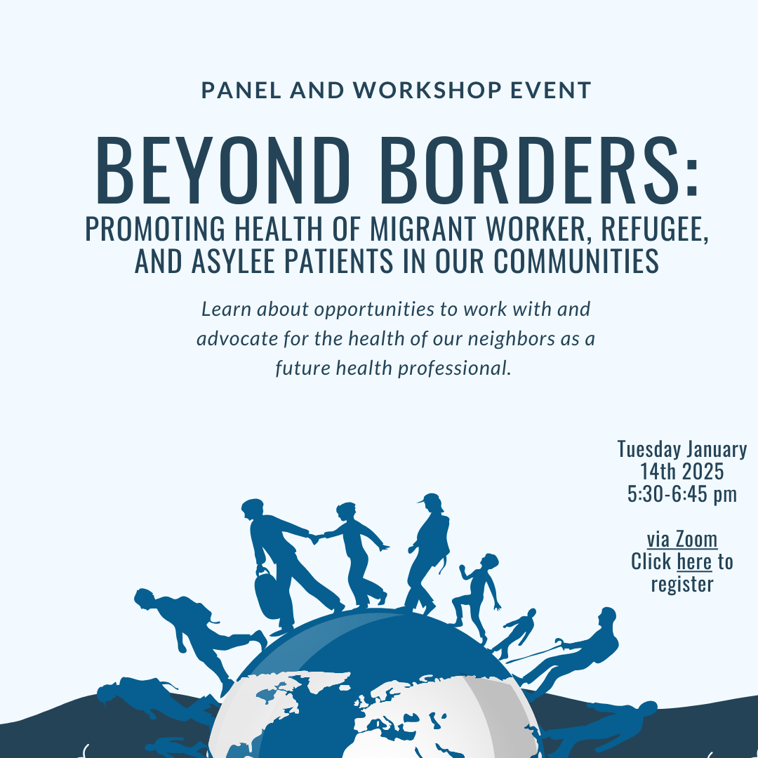 Hope your new year is off to a great start! Duke's Family Medicine Interest Group and collaborators from UNC FMIG, Campbell University, and Duke invites you to our first ever "Beyond Borders: Promoting Health of Migrant Worker, Refugee, and Asylee Patients in our Communities" event on Tuesday January 14th 5:30-6:45 pm EST via Zoom.<https://duke.zoom.us/j/91400068069?pwd=jzy5bx0GxDQbVbXIOqf9QGQGOAb8aQ.1#success>