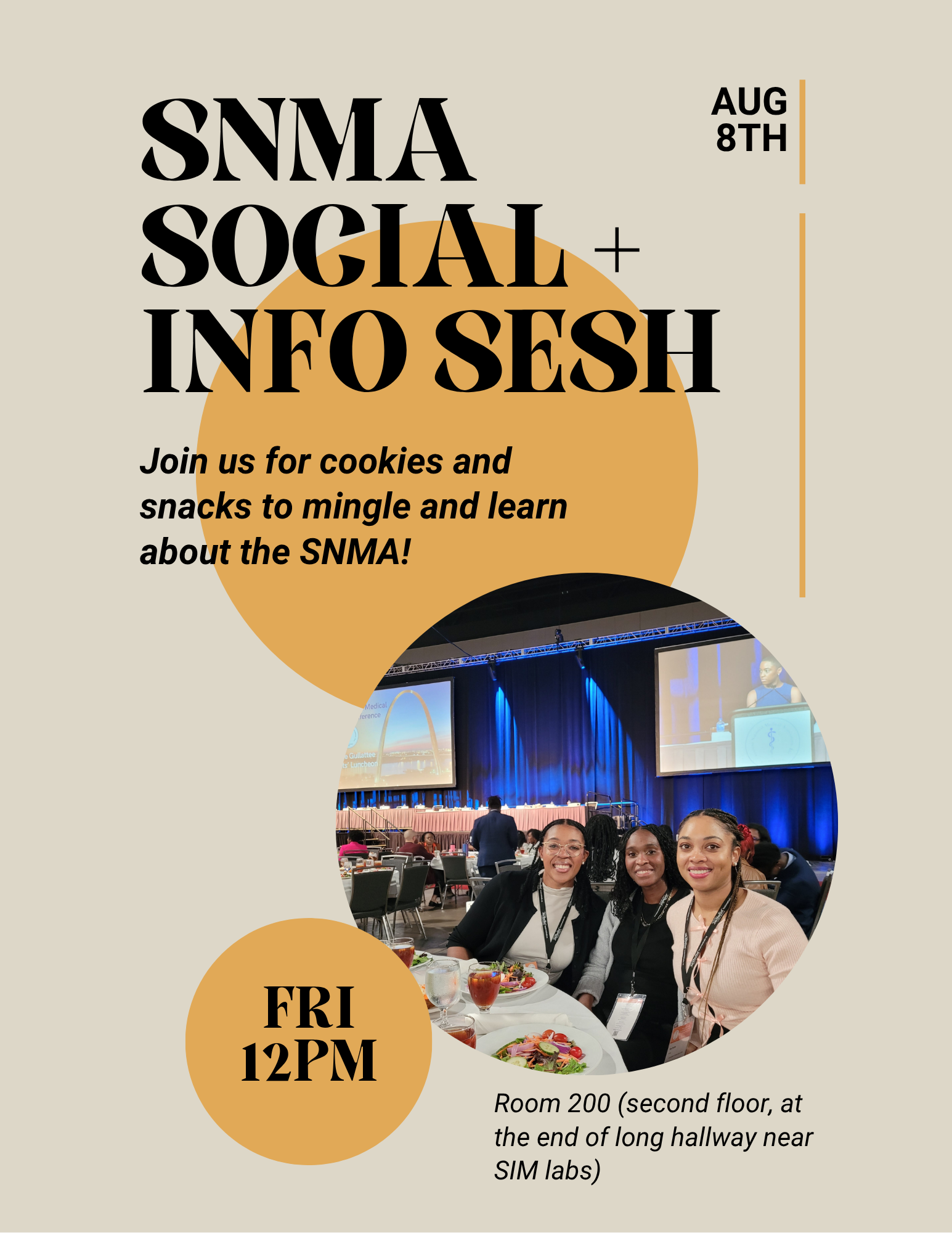 Join us THIS Friday, August 8th at 12:00 PM in Room 200 to get to know some classmates, eat some snacks and learn more about the SNMA!