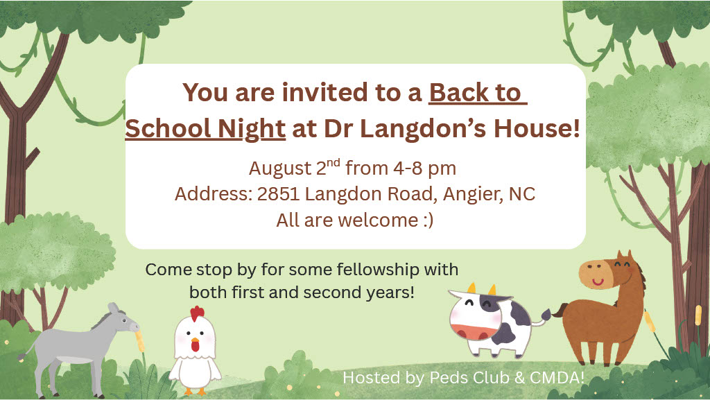 The Pediatric Medicine Club and CMDA are hosting a Back to School Night at Dr. Langdon's house for our first and second years to meet!! This event will be on August 2nd, from 4-8pm floating!