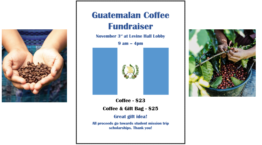 We are spreading the word around Levine and Smith Halls about a great fundraiser coming up on November 3rd. We are selling coffee we got in Guatemala as a fundraiser to support our students’ mission trip costs!