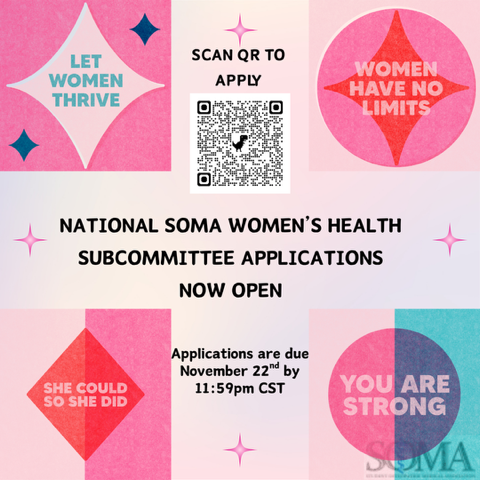 CALLING ALL SOMA MEMBERS!! We are now accepting applications for the Women's Health Subcommittee- a new addition to our DEHI Committee! Applications will be due by November 22nd at 11:59pm CST. If you have any questions about the committee's roles and responsibilities and / or time commitment, please reach out to our DEHI Director Shamirah Johnson (diversityequityhealth at studentdo.org<mailto:diversityequityhealth at studentdo.org>) or our NBD Chair, Raelynn Dorscheid (nbdchair at studentdo.org<mailto:nbdchair at studentdo.org>).