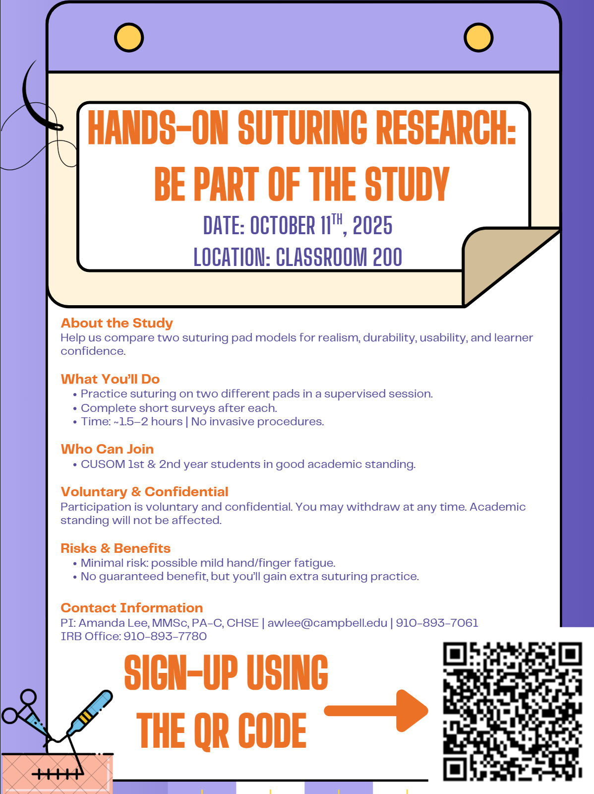 This is a chance to gain extra suturing practice, help guide improvements in simulation training, and contribute to educational research — all in a low-pressure, supportive environment.