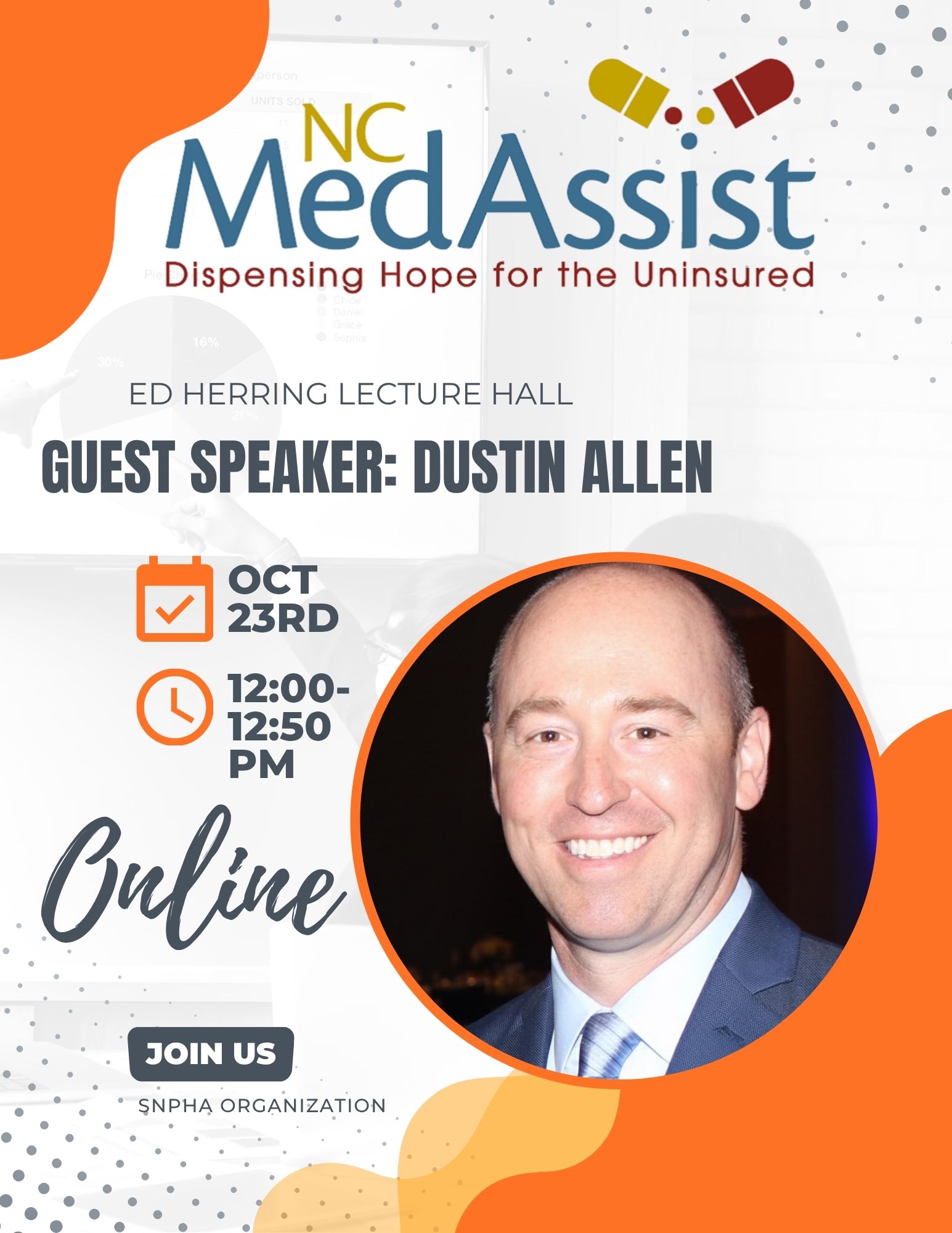 On behalf of SNPhA, I am excited to announce that we are welcoming Dustin Allen, a representative from North Carolina Med-Assist, October 23rd, in Ed Herring Lecture Hall at 12:00 pm. Dustin will go over what NC Med-Assist stands for, what they do, how they impact residents of North Carolina, and how you can take part in such a great cause.