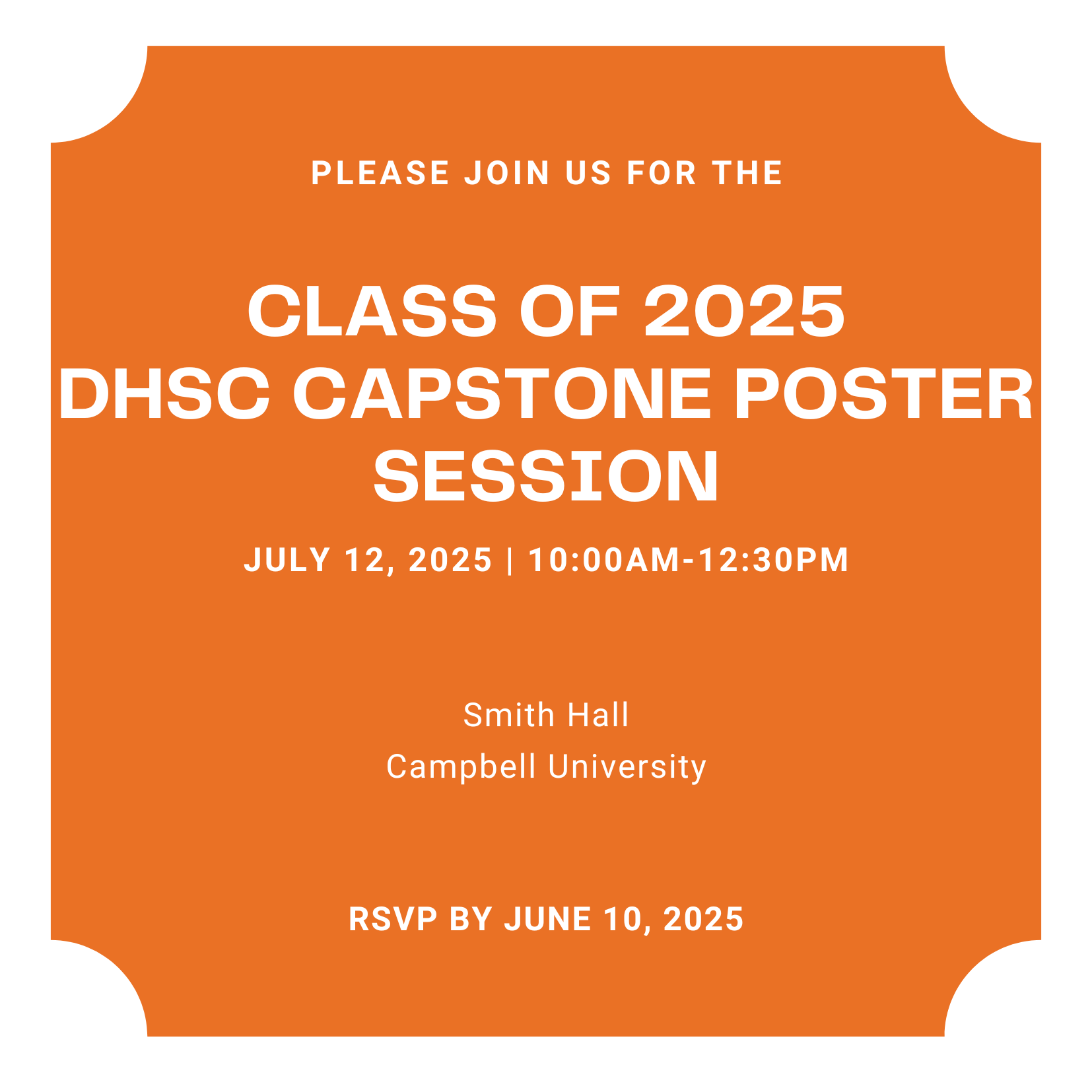 Please see the invitation for the Class of 2025 Capstone Poster Session. The poster session will be held on July 12, 2025, from 10:00AM to 12:30PM in Smith Hall on the health sciences campus of Campbell University.