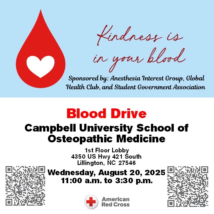 Student Government Association, Anesthesia Interest Group, and the Global Health Club are proud to sponsor an American Red Cross Blood Drive on Wednesday, August 20th! The drive will take place in the main lobby of Levine Hall from 11 AM to 3:30 PM.