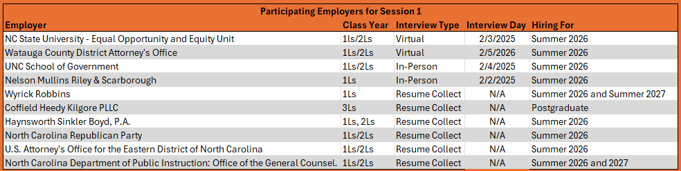 Please note: Although many large law firms are recruiting this year through direct applications on their websites and/or Flo Recruit rather than OCI, we encourage students interested in Big Law to apply through OCI even if they have already applied directly on the firm’s website and/or Flo Recruit (for example, Nelson Mullins).