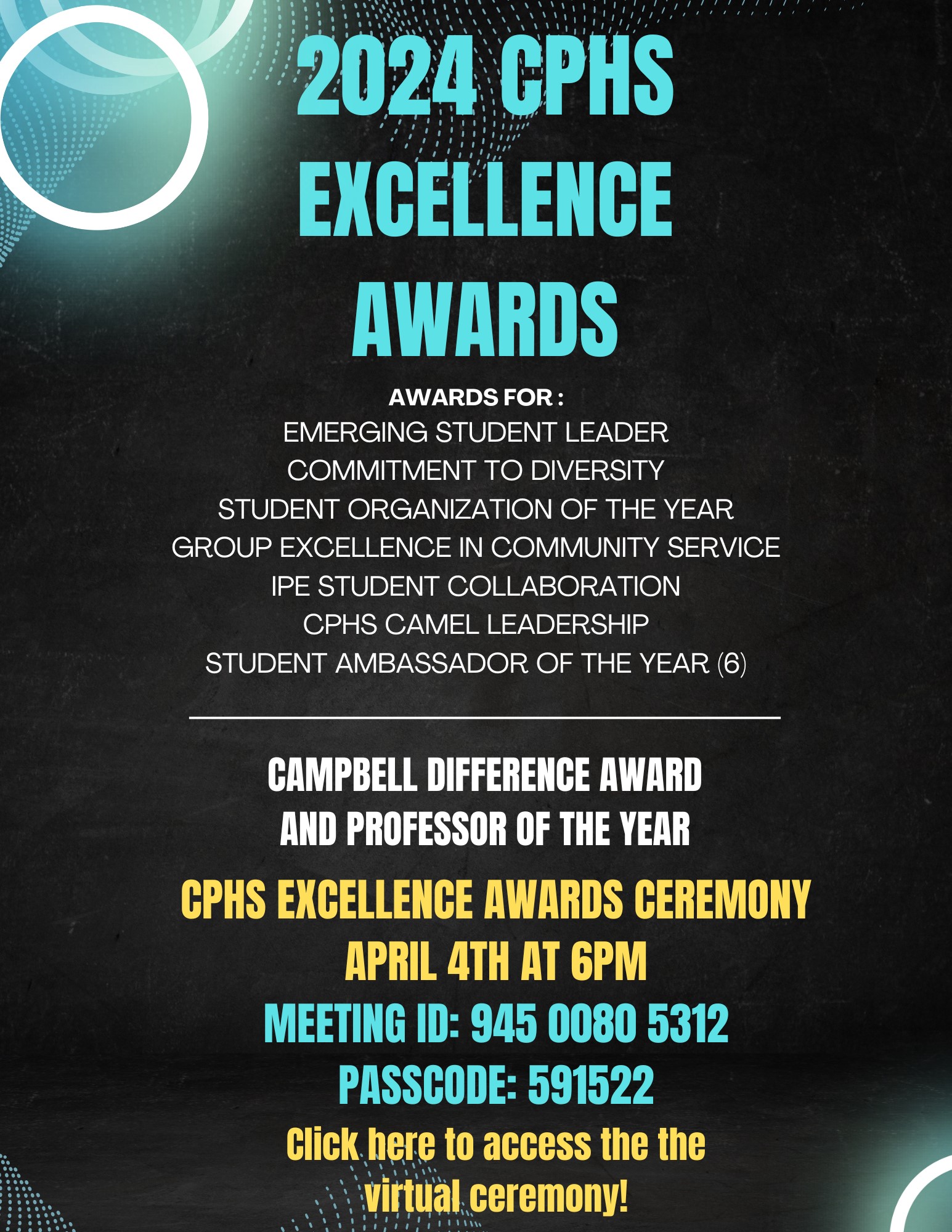 * The Virtual Excellence Awards Ceremony will be held on April 4th at 6 pm. We hope to see you there to celebrate all of our wonderful CPHS nominees and recipients this year! Ceremony information and a link to the ceremony is included in the flyer below.