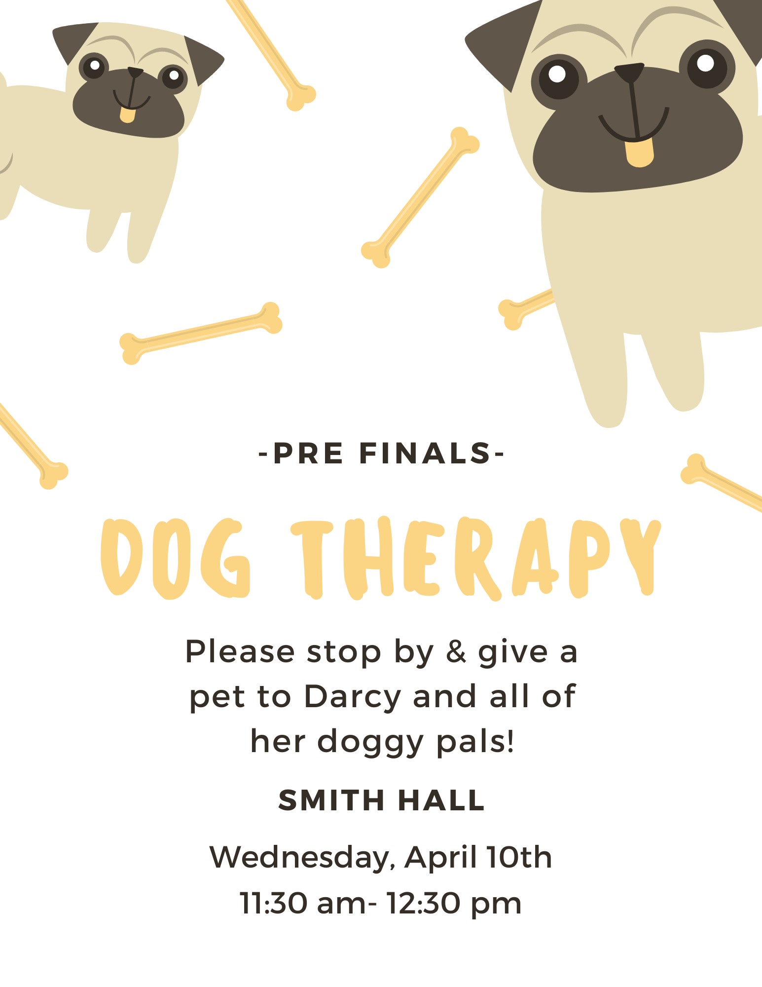 * Dog Therapy with Darcy and all of her doggy pals will be held outside at the back of Smith Hall on April 10th from 11:30 am to 12:30 pm. Please be sure to come give them some pets and get all of the doggy cuddles that you need before the end of the semester!