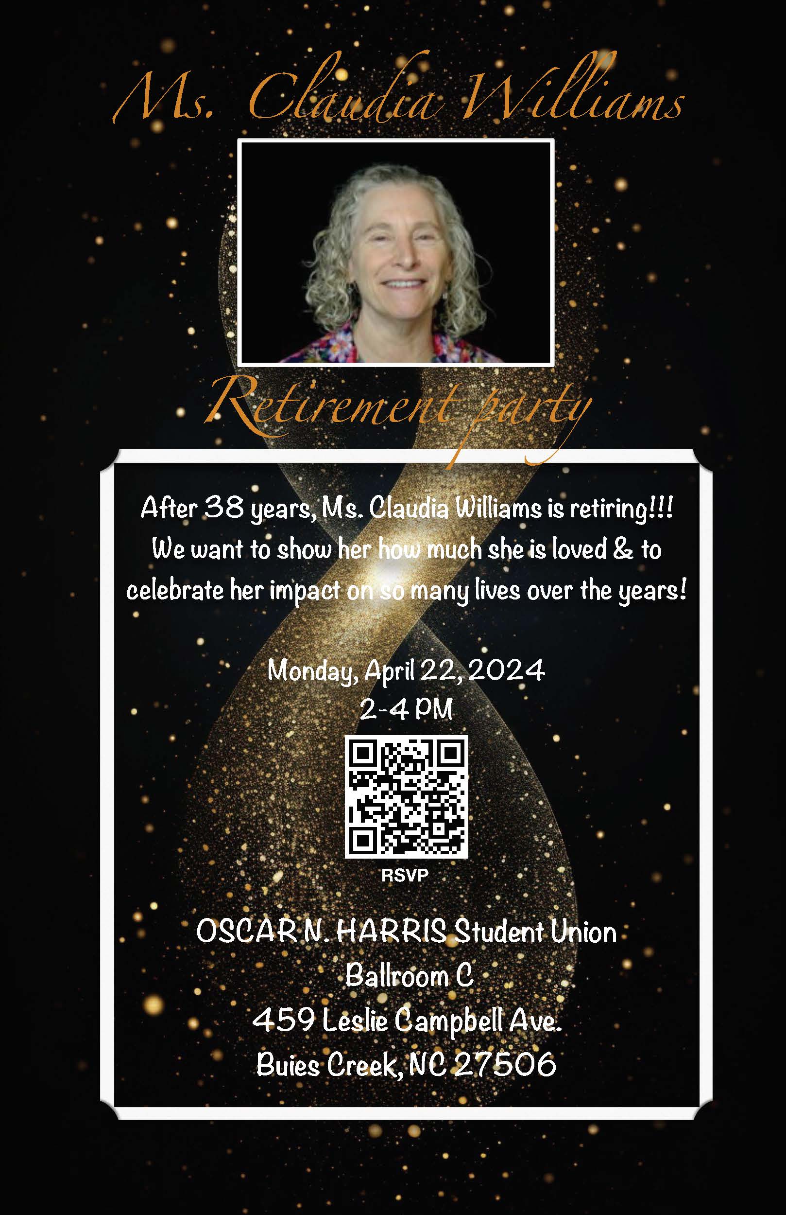 The Biology Department is planning a retirement celebration for Claudia Williams, and we would like to try to reach out to as many of her colleagues as well as her current and past students to invite them to come help us celebrate Claudia and the impact that she has made on so many lives over the years. The celebration will be on Monday, April 22nd from 2:00-4:00 pm in Ballroom C of the Student Union. Please RSVP with the QR code below.