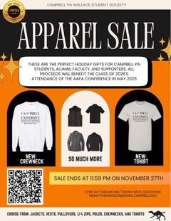 > THE PA PROGRAM IS HAVING AN APPAREL FUNDRAISER!! There is no guarantee that we will do another order in the SPRING so GET YOUR GEAR NOW! PA items are not sold in the Campbell Bookstore. This order will close on November 27th at 11:59 PM. These items serve as the perfect holiday gifts for current students, prospective students, alumni, and Campbell PA supporters.