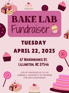I wanted to make you all aware of the Campbell University Physician Assistant Bake Lab Fundraiser (67 Marshbanks St, Lillington, NC 27546) that is happening TOMORROW, Tuesday, April 22nd from 10 AM-6 PM. Go grab a sweet treat to fuel you through the day/week! A portion of all sales from the display case will be used to support our students attending their annual AAPA conference.