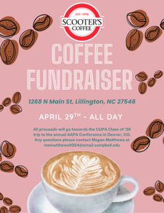 The Campbell University Physician Assistant Program is having a fundraiser at Scooter’s Coffee in Lillington TOMORROW, Tuesday, April 29th from 5:30 AM-8 PM. A portion of all proceeds will benefit the Wallace Student Society and the CUPA Class of 2026 annual conference trip in May.