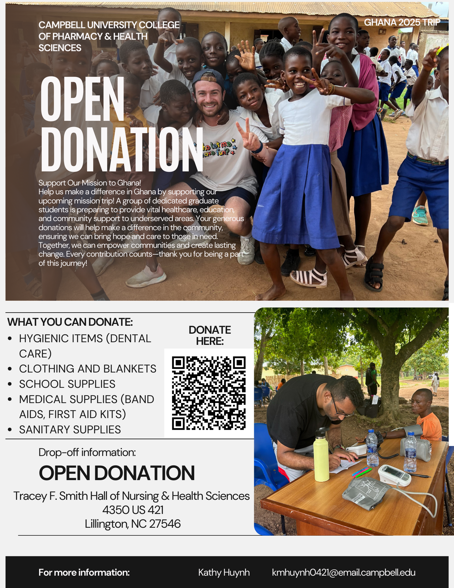 The Campbell University College of Pharmacy & Health Sciences is organizing a mission trip to Ghana in 2025, and we need your support! A dedicated team of graduate students will be traveling to provide essential healthcare, education, and community outreach to underserved areas.