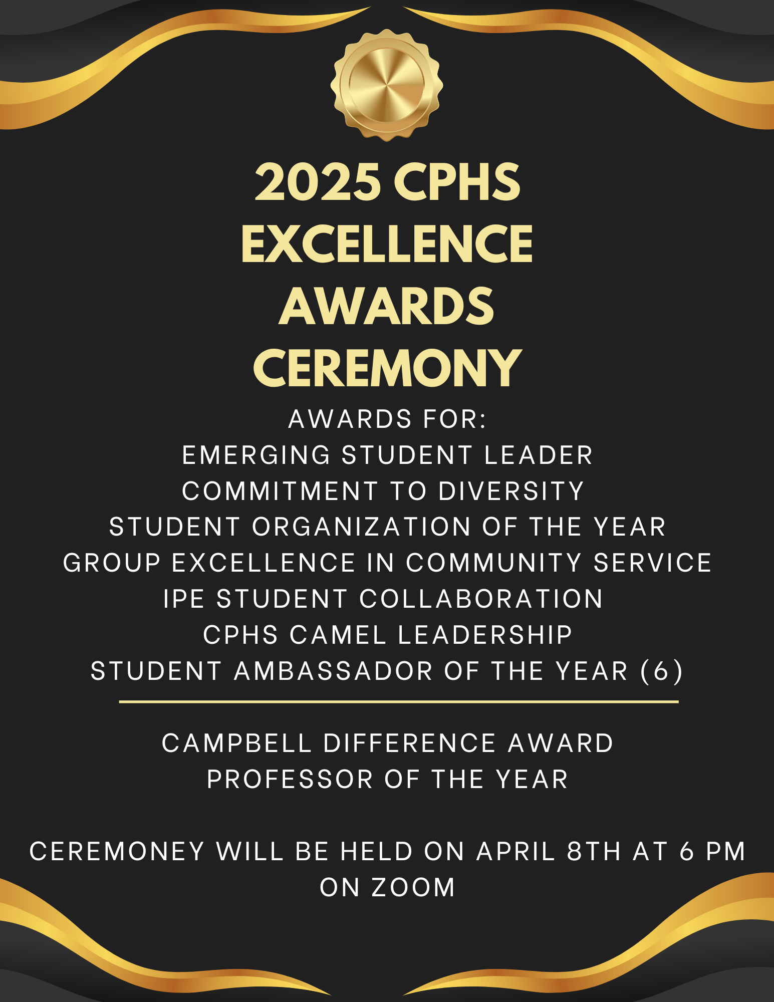 We are excited to invite you to the CPHS Excellence Awards Ceremony, where we will celebrate the outstanding achievements of our students, faculty, and staff. Please join us as we recognize those who have demonstrated excellence in academics, leadership, service, and professional contributions.