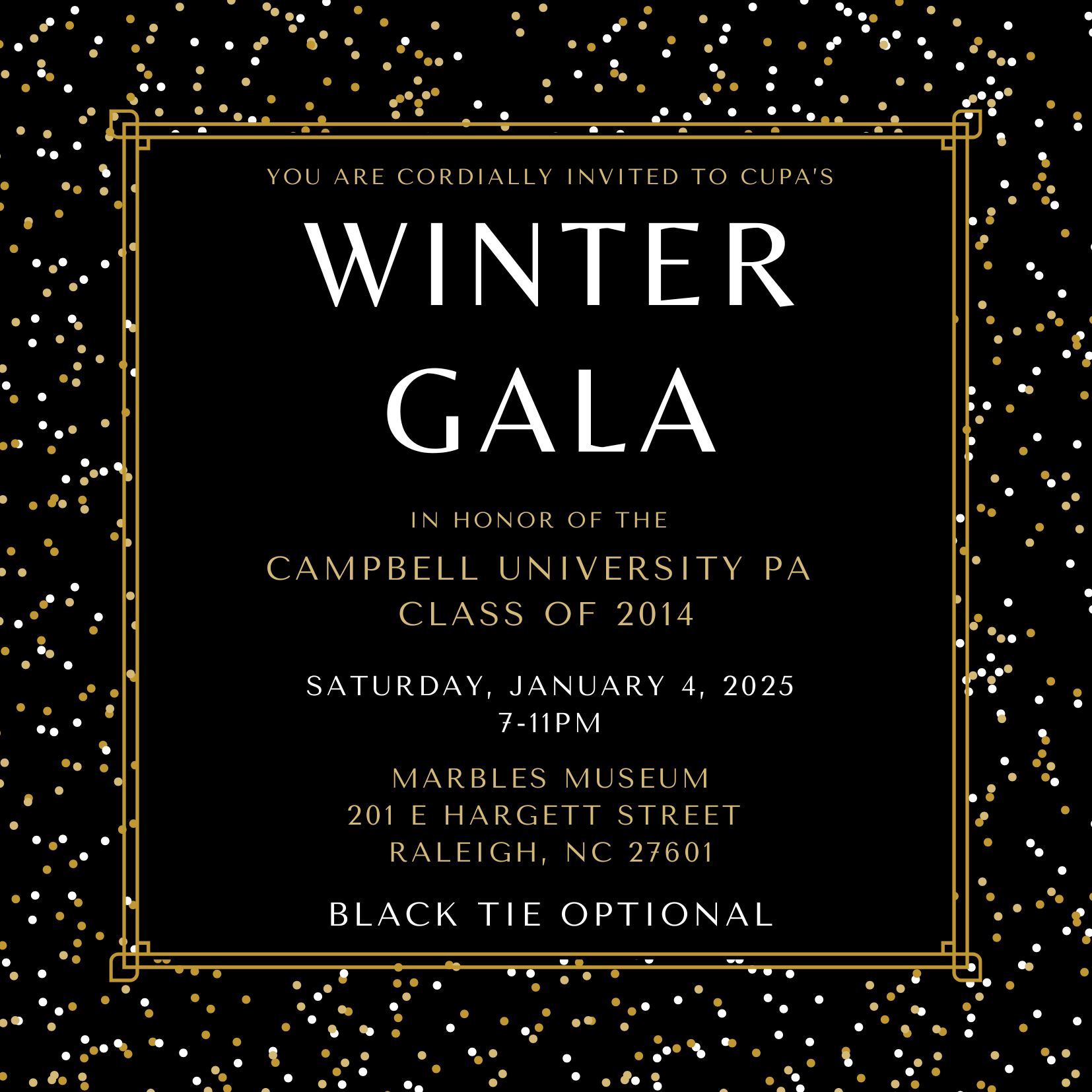 We are thrilled to invite you to CUPA’s second annual Winter Gala on the evening of Saturday, January 4th. This night is a celebration in honor of the Campbell University PA Program Class of 2014. This special event promises an evening filled with elegance, fun, and reconnection with fellow alumni and friends.