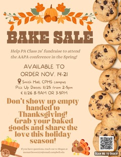 The Class of 2026 Physician Assistant Program is COLLECTING ORDERS for baked goods to share with friends and family. Nobody should show up to Thanksgiving empty handed…WE ARE HERE TO HELP! Sales open on Thursday, November 14th and close on Thursday, November 21st. Items will be available for PICKUP ONLY at Smith Hall on Monday, November 25th 2-5 PM or Tuesday, November 26th 8-9 AM or 3-5 PM. If neither of these times work, please email Megan Matthews (contact on flyer) PRIOR TO PLACING YOUR ORDER to see if we can make accommodations.