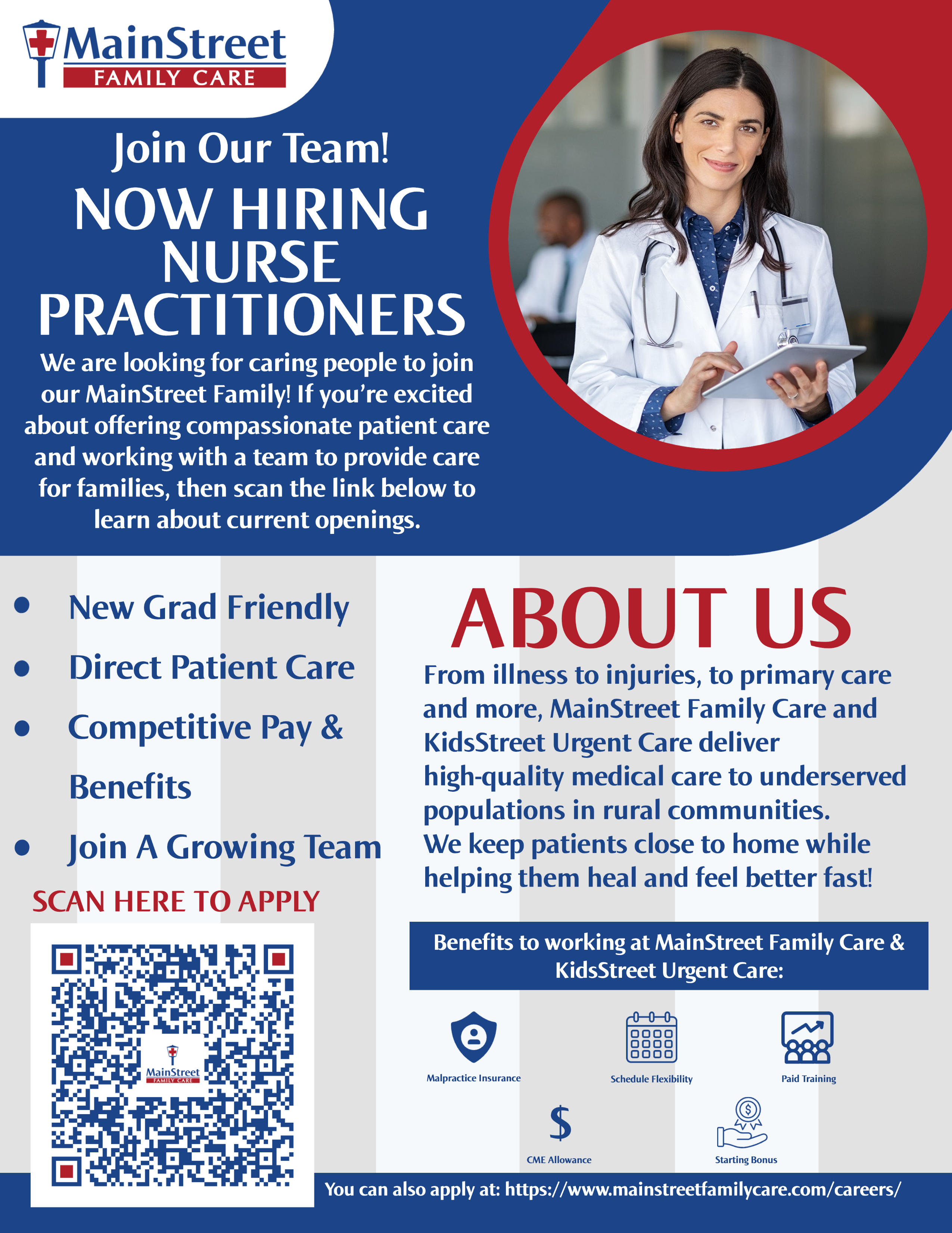 As we continue to grow and expand, we have wonderful new career opportunities<https://mainstreetfamilycare.applicantstack.com/x/openings?pge=1>, as well as preceptorship opportunities. Here<https://www.mainstreetfamilycare.com/locations/> lies a list of our clinic locations. Please feel free to reach out to me in regard to career opportunities as well! Below is a list of our current career opportunities.