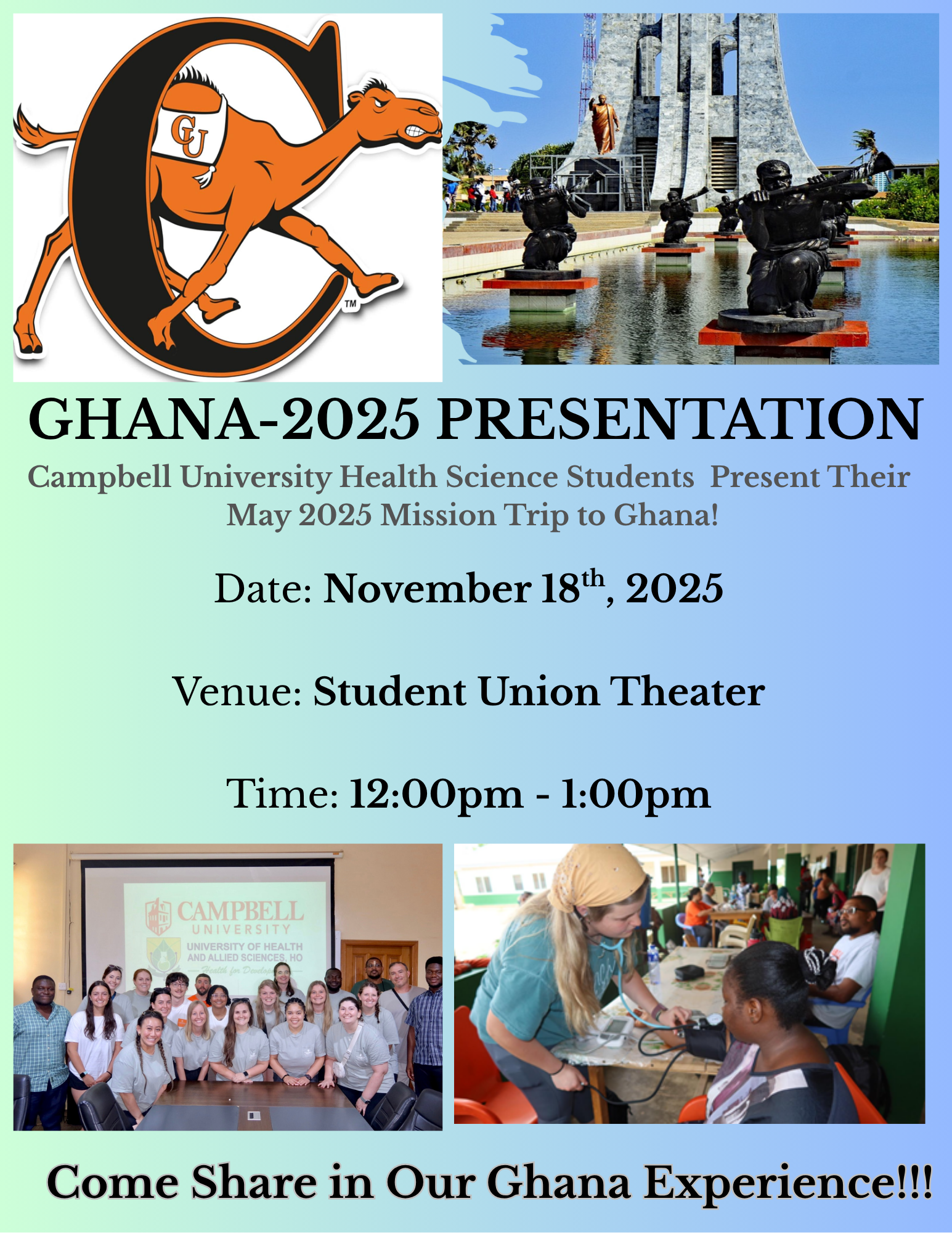 We are excited to invite you to an upcoming presentation highlighting student experiences from our 2025 CU Health Sciences mission trip to Ghana. During this session, students will share their experiences, cultural insights, and key learning outcomes from this unforgettable journey! See attached flyer for more information.