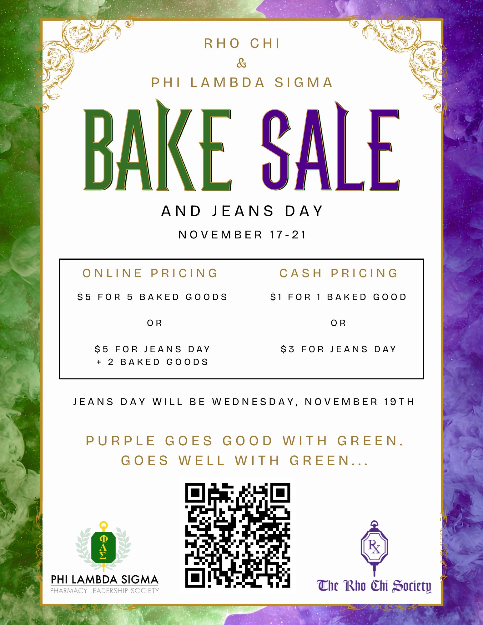 Phi Lambda Sigma and Rho Chi are excited to host our joint bake sale in the Maddox Lobby this week. From November 17–21, we’ll be offering a variety of baked goods with the following pricing options: