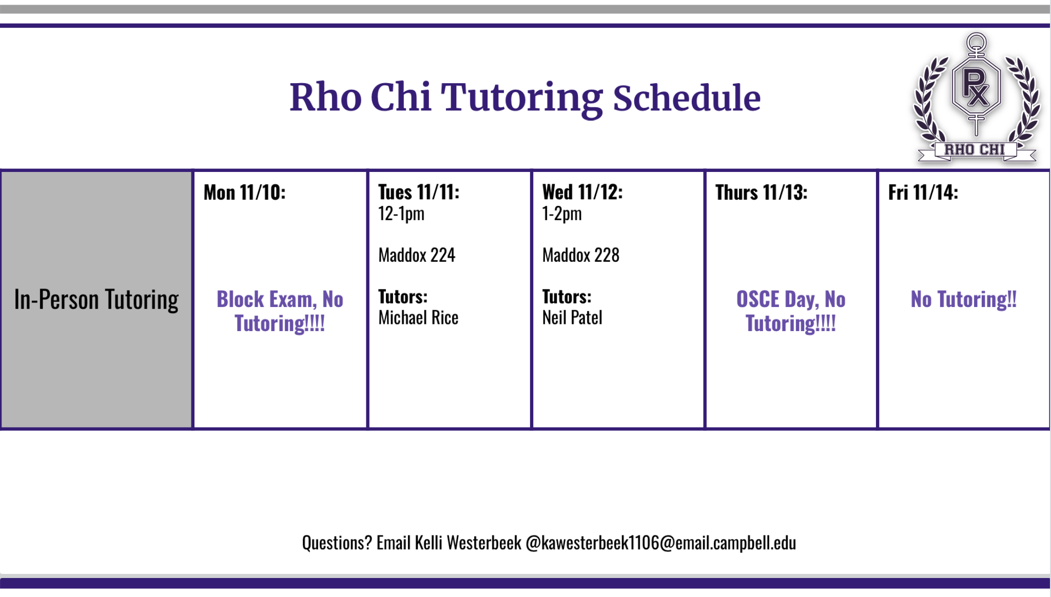 I hope you’ve had a great week. The tutoring schedule for Rho Chi the following week is as follows. Please let me know if you have any questions, and good luck studying for the block exam!