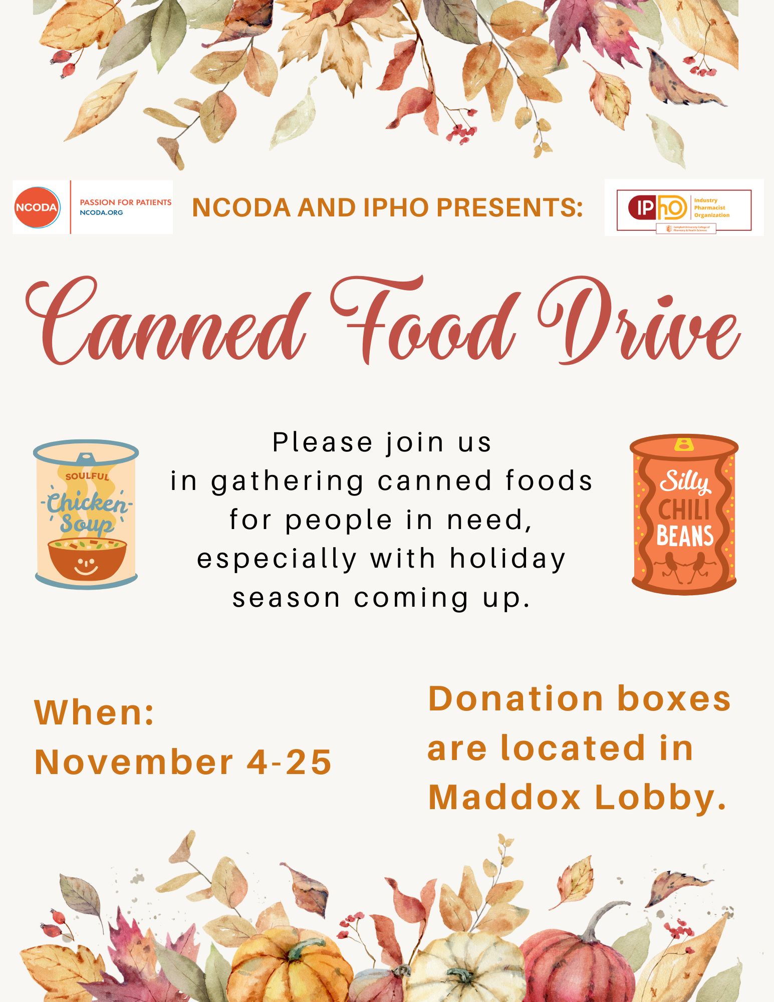 NCODA and IPhO are teaming up to collect canned foods in the Maddox Lobby.