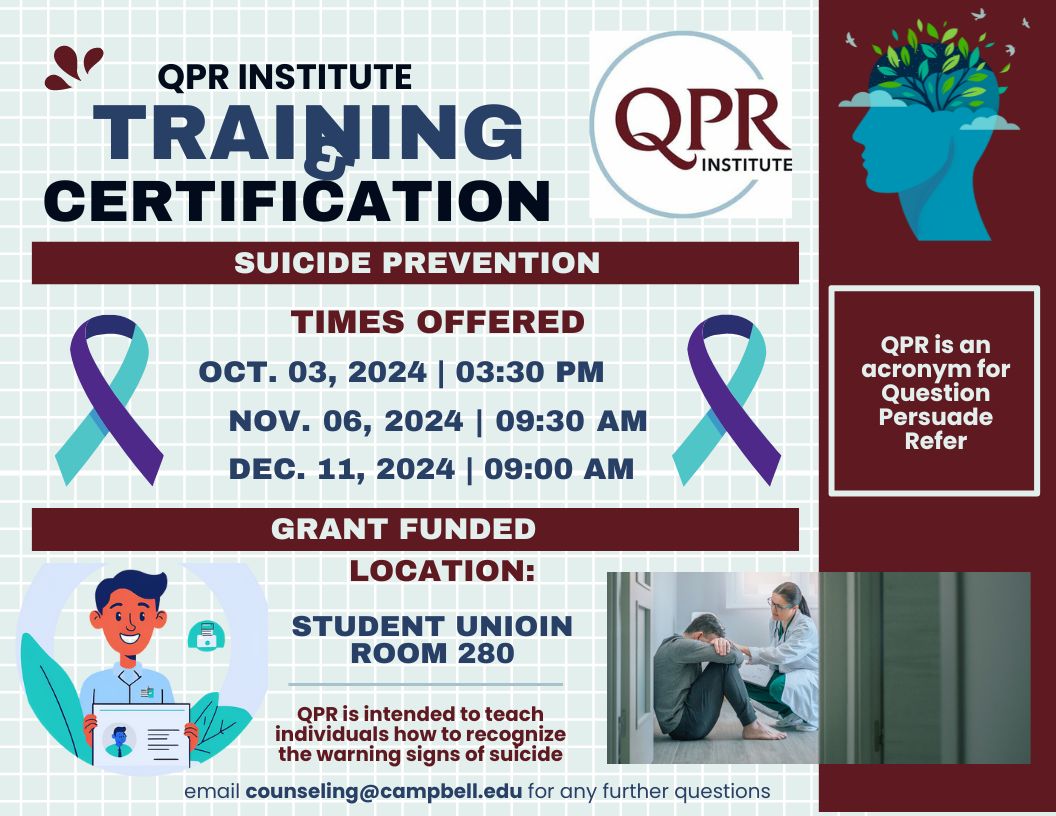 I hope this message finds you well! Our main campus Counseling Services is offering an QPR Training and Certification with three opportunities for you to complete it.