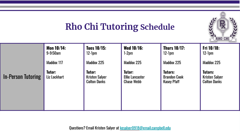 Rho Chi tutoring will kick off *next week 10/14-10/18*. The schedule can be