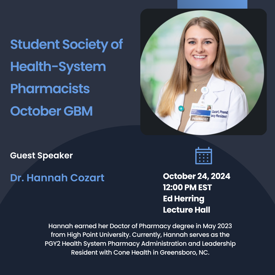 Lecture Hall*. Our guest speaker will be *Hannah K. Cozart, PharmD* joined