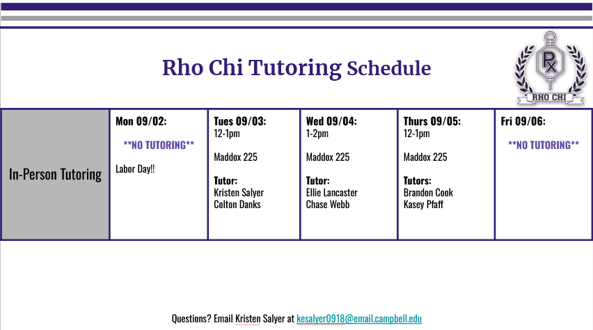 I hope you all had an awesome long weekend! Below are Rho Chi's tutoring