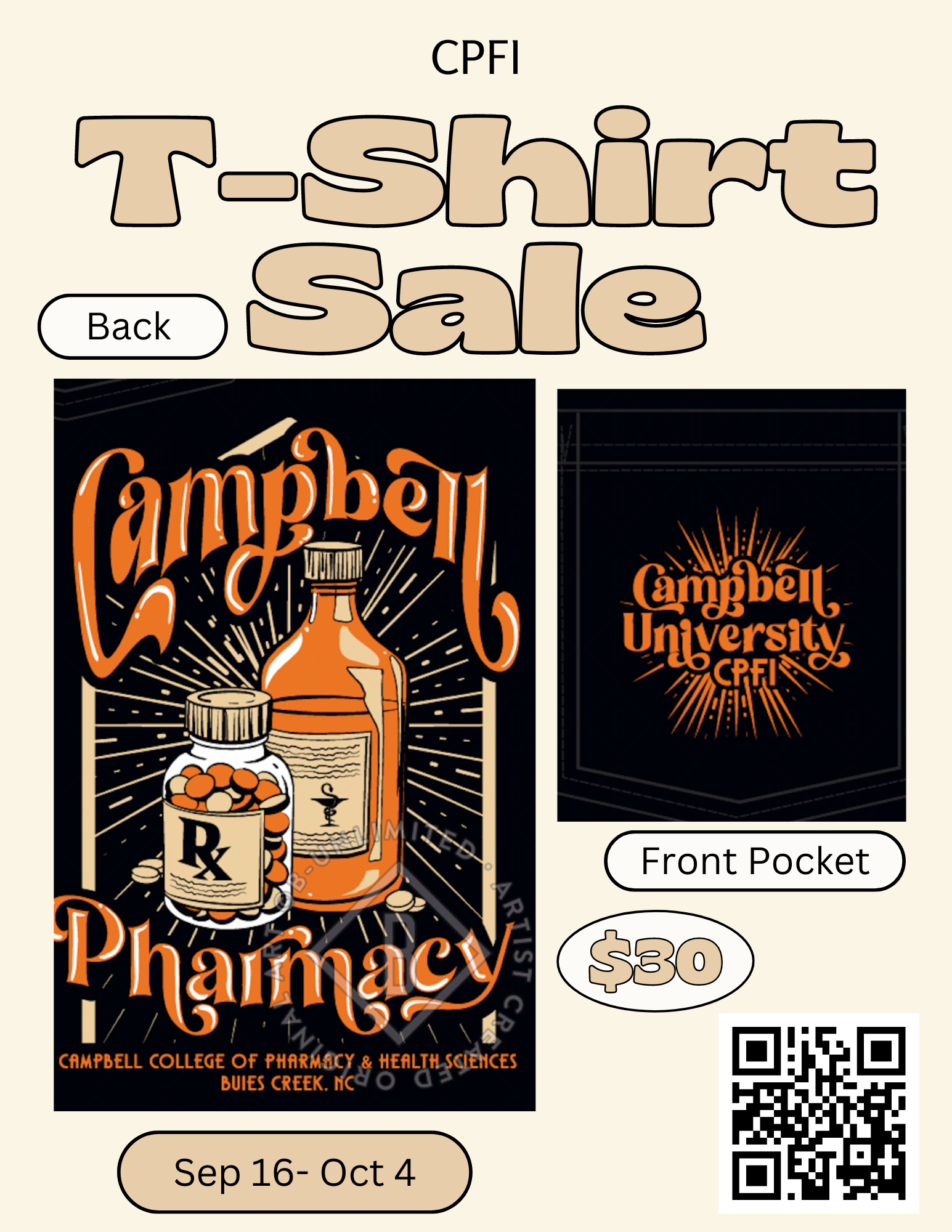 CPFI is having a T-Shirt sale fundraiser from September 16-October 4. T shirts will be $30 each and the design is on the flyer below!! Please use this link<http://igfn.us/form/IKDfdg> to purchase!! We hope you like the design and want to add one more Campbell Pharmacy shirt to your collection!! 😃