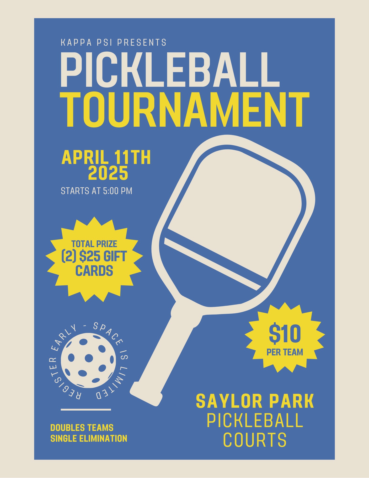 Kappa Psi is hosting a doubles Pickleball Tournament next Friday, April 11th