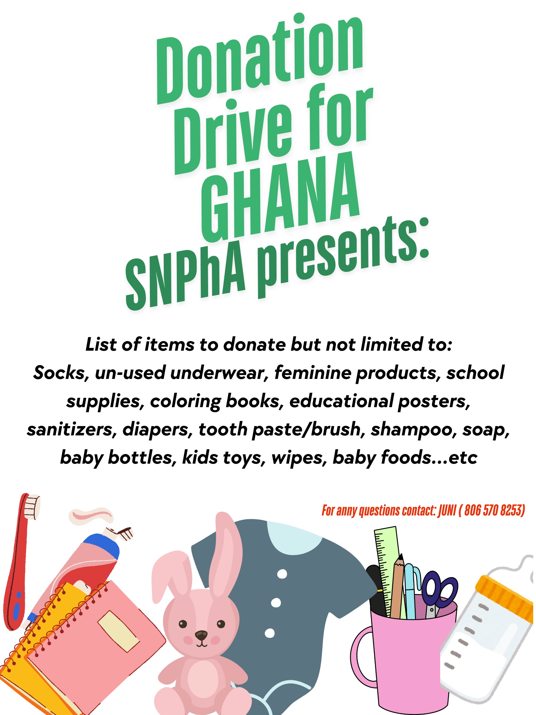 This is a final reminder about SNPhA’s donation drive in collaboration with Public Health students for the upcoming Ghana mission trip! Your contributions will directly support those in need, and as a bonus, extra credit is available for participating students.