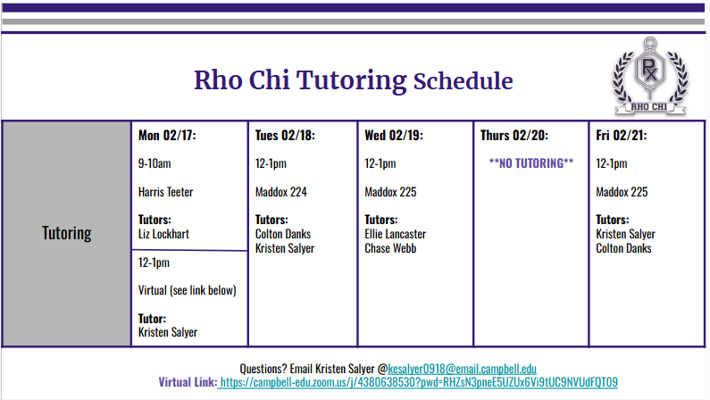Please see below for the Rho Chi tutoring schedule for this week. Let's