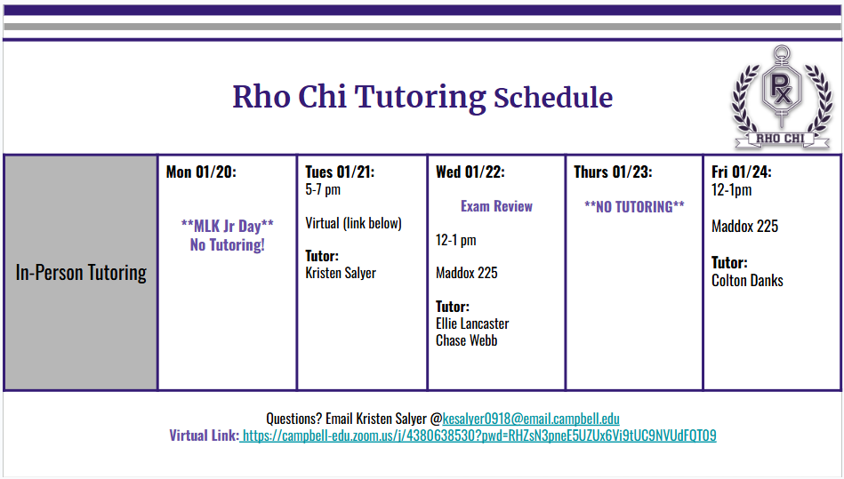 will find the Rho Chi tutoring schedule for this week. Due to the holiday,