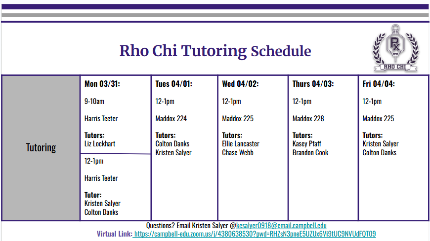 Please see the Rho Chi tutoring schedule for the upcoming week below. As