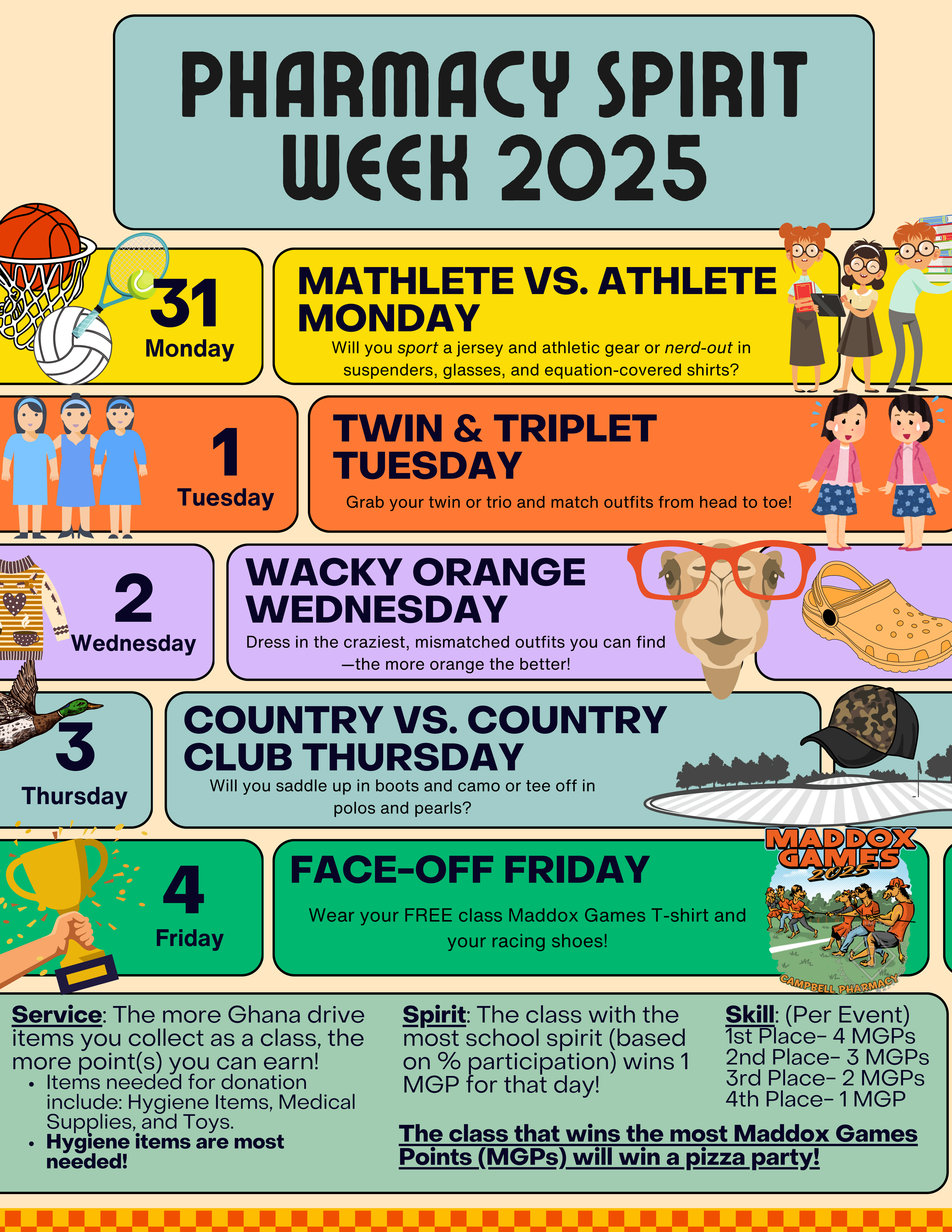 > For each day of spirit week, the pharmacy class (P1, P2, P3,