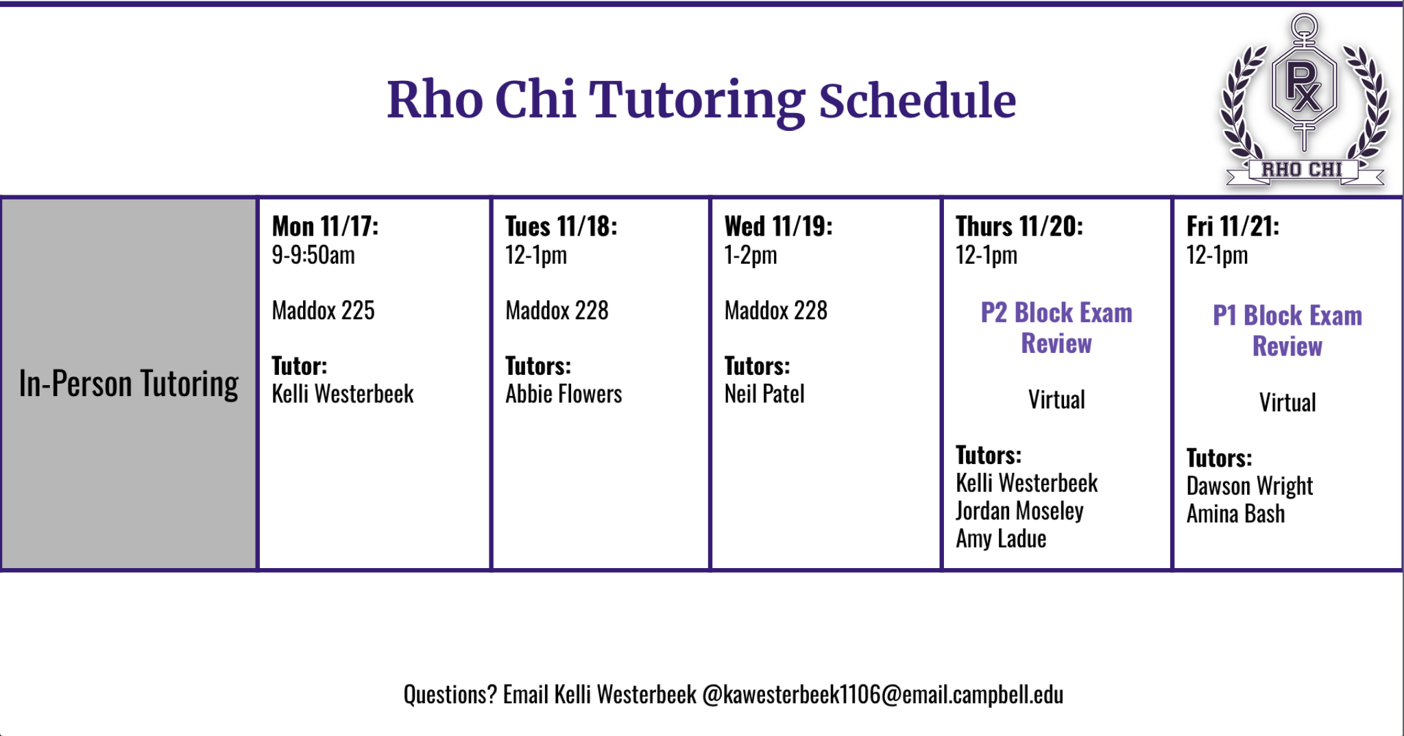 I hope you’ve had a great weekend. The Rho Chi tutoring schedule for the week is as follows. Please let me know if you have any questions!