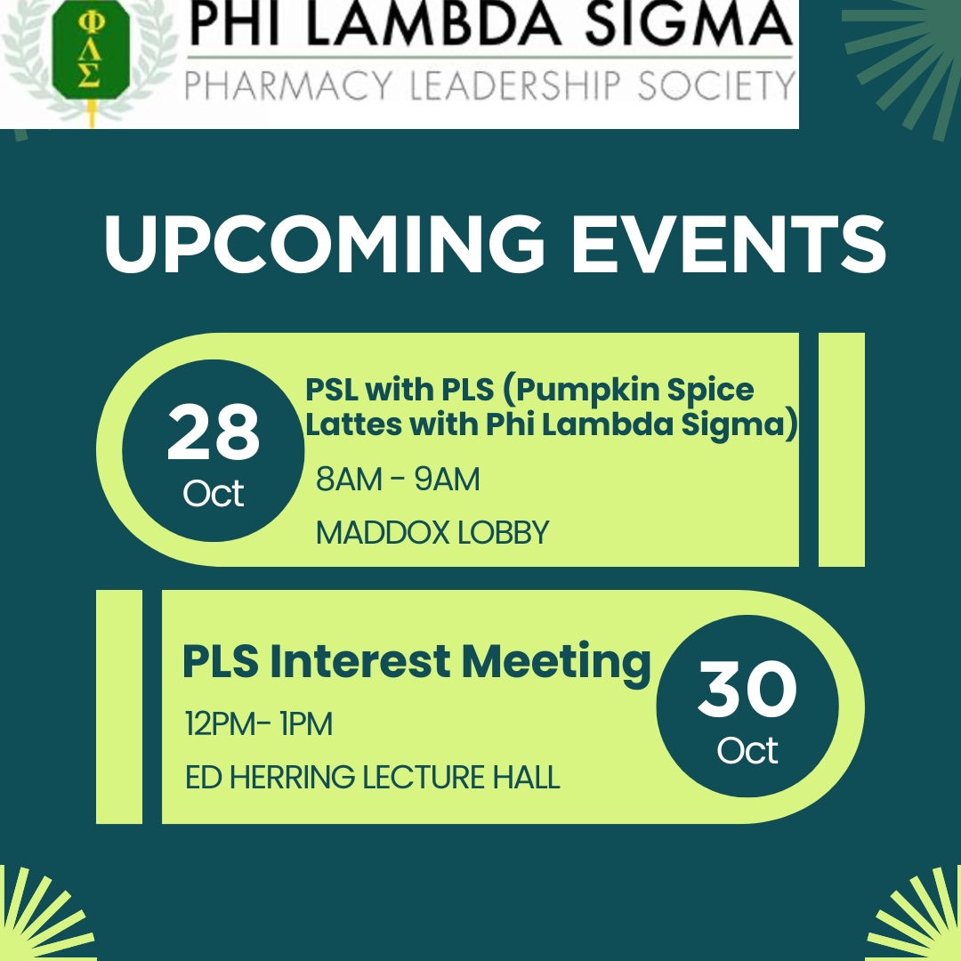 Phi Lambda Sigma (PLS), the Pharmacy Leadership Society, invites you to two exciting events this month! Please mark your calendars!!!