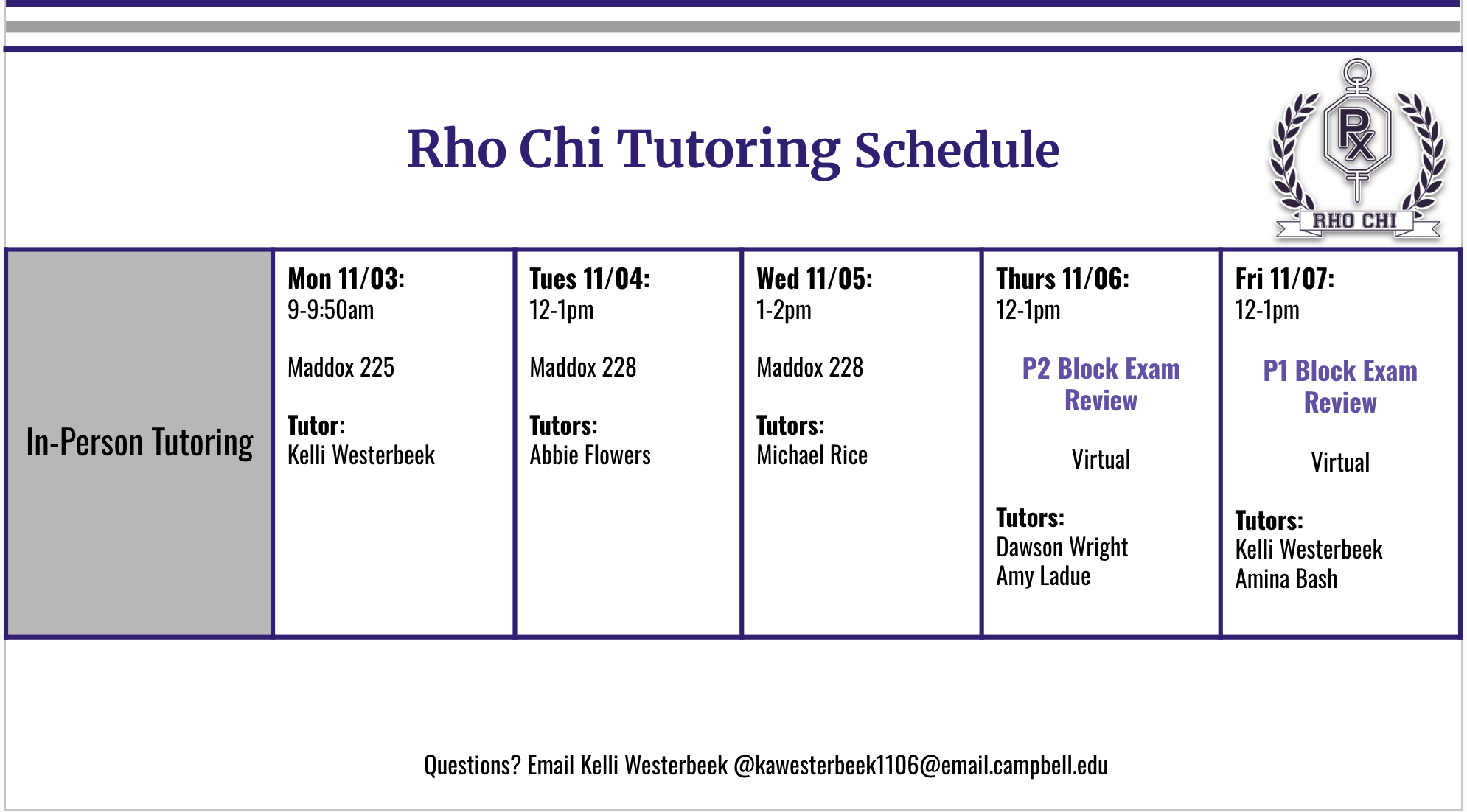 I hope you're doing well! The next week's Rho Chi schedule is as follows.