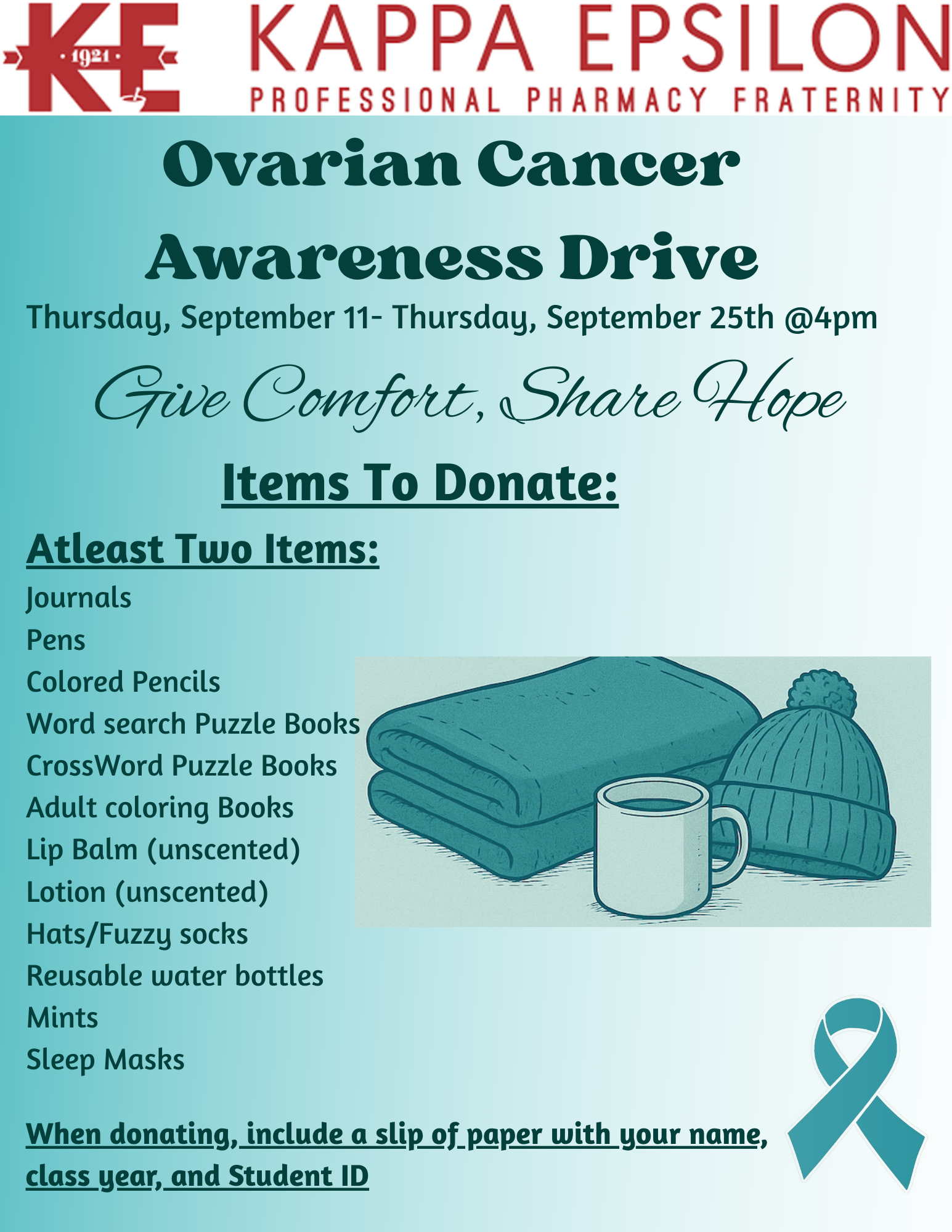 Kappa Epsilon Pharmacy Fraternity is excited to host a Cozy Care Kit Drive in honor of Ovarian Cancer Awareness Month. Donations will benefit cancer patients at Duke Hospital by providing them with thoughtful comfort packages. This is a wonderful opportunity to give back to our community, and each class will also have the chance to earn extra credit by participating!