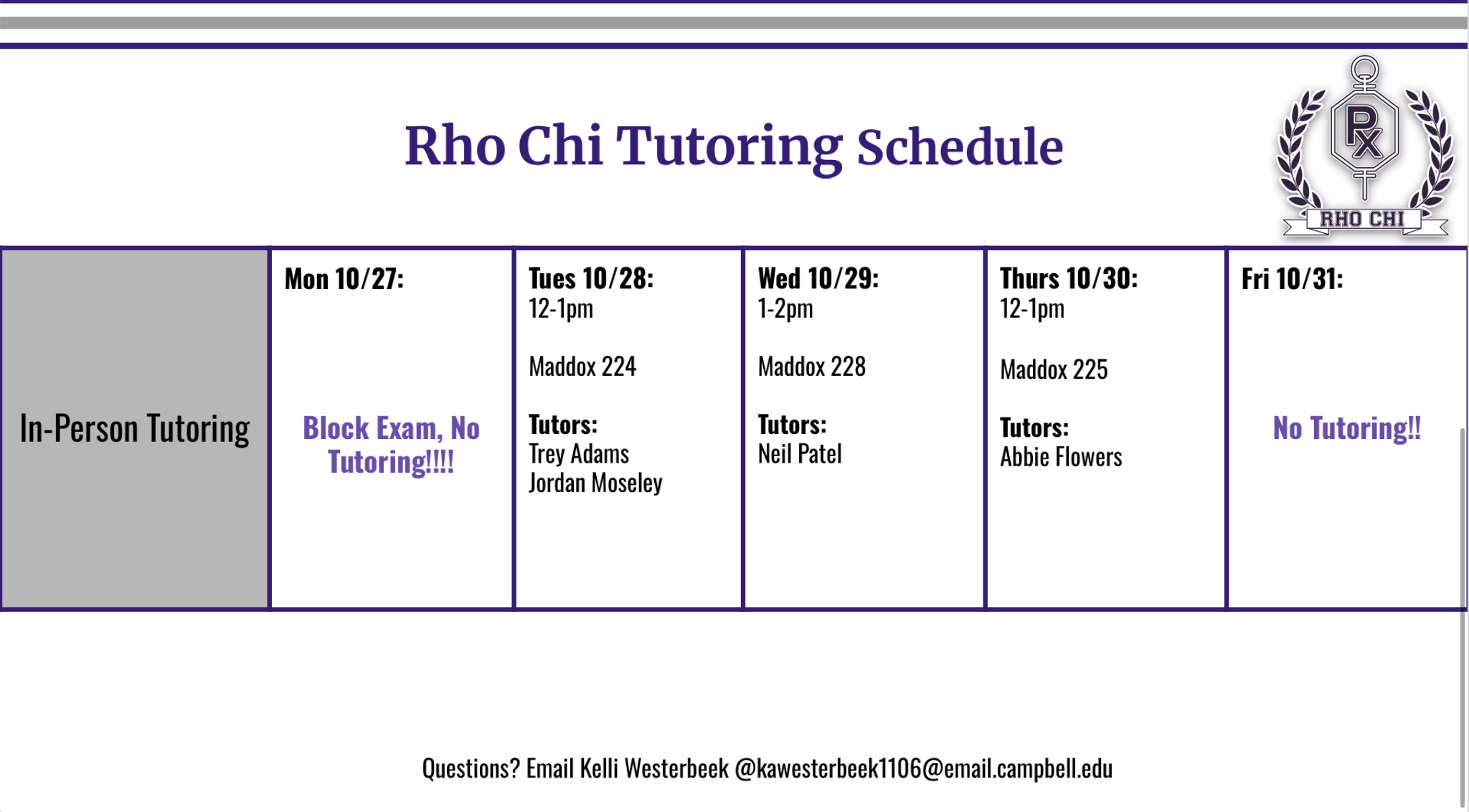I hope you’re having a good weekend! The Rho Chi tutoring schedule for the next week is as follows. Best of luck with your studying for Monday, and please feel free to reach out with any questions!