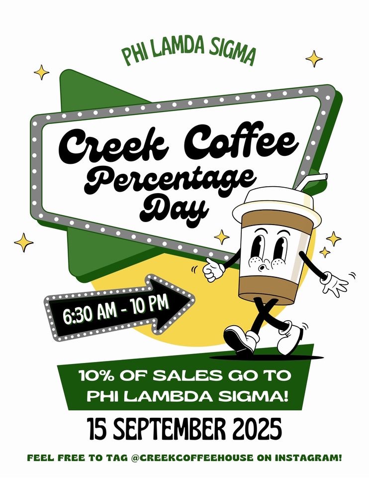 Phi Lambda Sigma, the Pharmacy Leadership Society, is excited to partner with Creek Coffee for a Percentage Day! On Monday, September 15, 2025, from 6:30 AM to 10:00 PM, a portion of all sales will be donated directly to Phi Lambda Sigma.