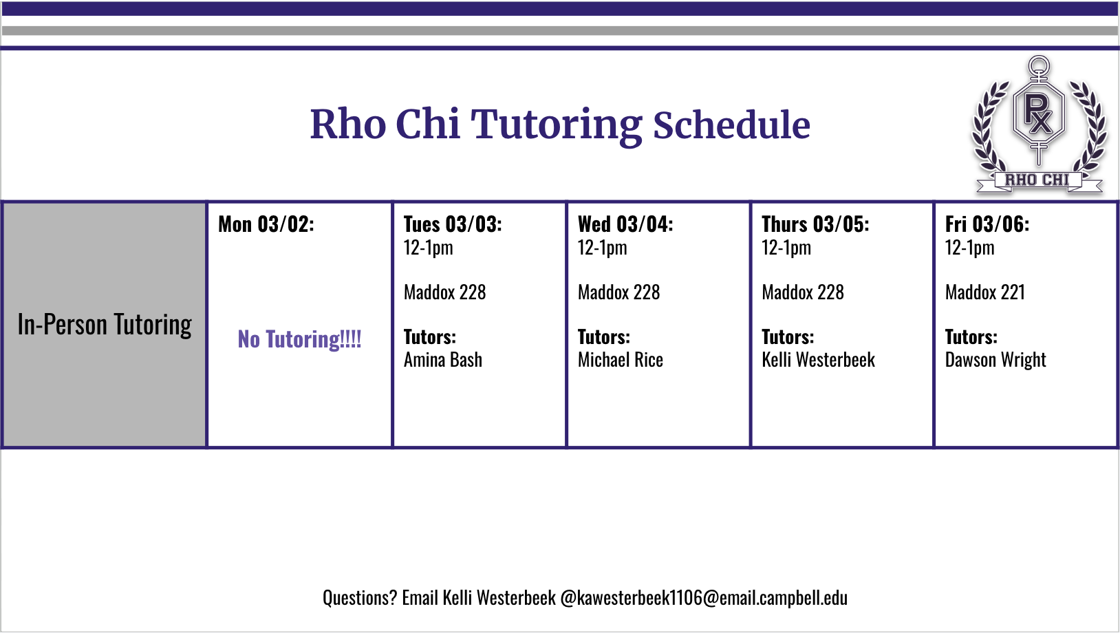 I hope you’ve all had a wonderful break! The Rho Chi tutoring schedule for this week is as follows. Please let me know if you have any questions.